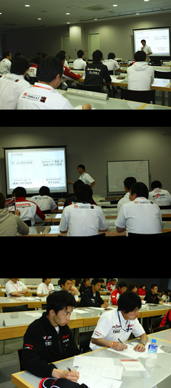 青木の質問を受け、テキストに自分なりの答えを書いていくドライバー達。