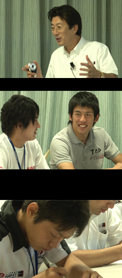 勉強会は、前々回、前回の復習からはじまりました。未来を描き、まずはそれを求めるということ。そのために、ドライビングテクニックや自身のメンタル・フィジカルの強化だけでなく、ファンやスポンサー、チームメンバーとの関係作りなども含めて努力する必要があるということ。スポンサーとの関係においては、距離感が非常に重要であり、レースに勝った時だけでなく、負けた時や、あるいはサーキットの外でどんな行動を取れるかが、距離感を縮めていくのだと学びました。これまでの復習を終えた青木は、ドライバーたちに質問を投げかけます。