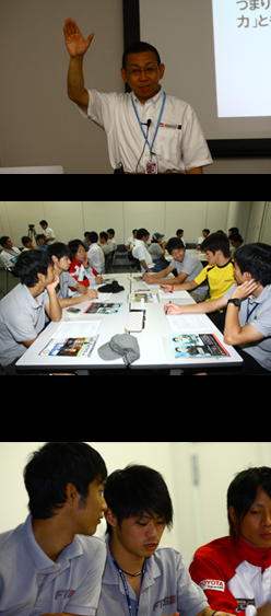 勉強会では、まず3月11日の東日本大震災後にF1ドライバーの小林可夢偉選手が取った行動を紹介しました。震災直後、大災害に見舞われた日本のために、小林選手は全てのF1チームとドライバーに協力を呼びかけて、iPhoneアプリを製作・リリースをしました。その収益金の全額が義援金として寄付されています。F1には、正式に全ドライバーや全チームを統括する組合は存在しません。小林選手はその熱意によって業界全体を動かしたのです。カテゴリの違い、立場の違いから、もちろんできることの範囲に差はあるものの、その核にある小林選手の気持ちに触れるドライバーたち。「その人が取る行動には、内側にある考えや想いが反映される」ということを学びました。