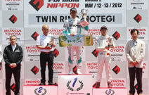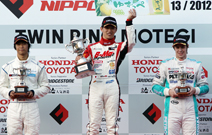 早朝のFCJのレースからの連戦による疲れからかゴール後、脱水症状で倒れ込んだ。後ろ3位には野尻。ホームグラウンドであるもてぎで、